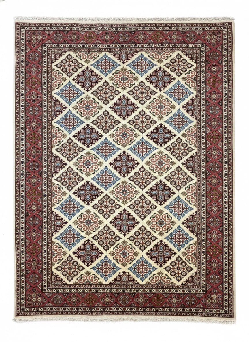Add subtle geometric elegance to your interior with this Persian Ilam Wool Rug, sized 4’2” x 6’1”. This rug features a refined geometric lattice design across the field. Therefore, it creates structure and visual balance without overwhelming the space. The cream and red palette adds warmth and contrast. Moreover, it complements both traditional and transitional interiors.